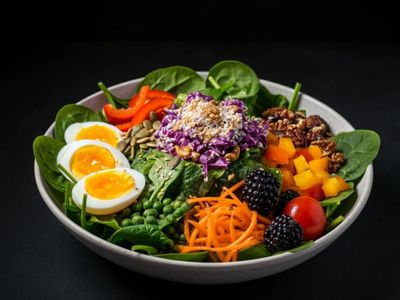 The many fresh, colorful ingredients of a good salad support your overall well-being. Spinach and lettuce are rich in vitamins and fiber. Tomatoes, carrots, and red onions are high in antioxidants, vitamins, and minerals. Boiled eggs, salmon, and chicken are good sources of protein. Berries add natural sweetness to a salad and are a good source of vitamin C. All of this is good for immune function, bone health, digestive health, weight management, heart health, cancer prevention, and brain health.